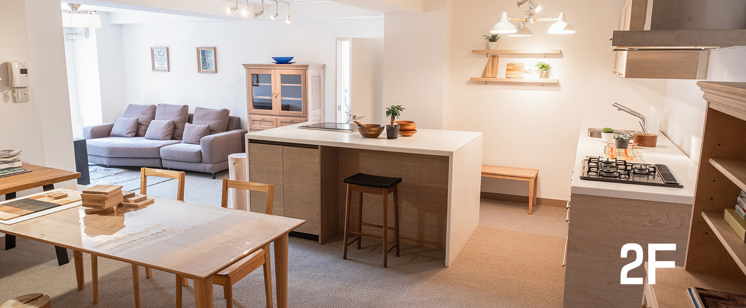 千駄ヶ谷駅から徒歩6分、国立競技場近くにあるオーダー家具ショールームの1F/2F(150㎡)を撮影・配信スタジオとしてご利用いただけます。ダイニングシーン、リビングシーン、キッチンシーン(アイランドキッチン&壁型キッチン)、ベッドシーン、デスクシーンなど様々な生活シーンをご用意しています。